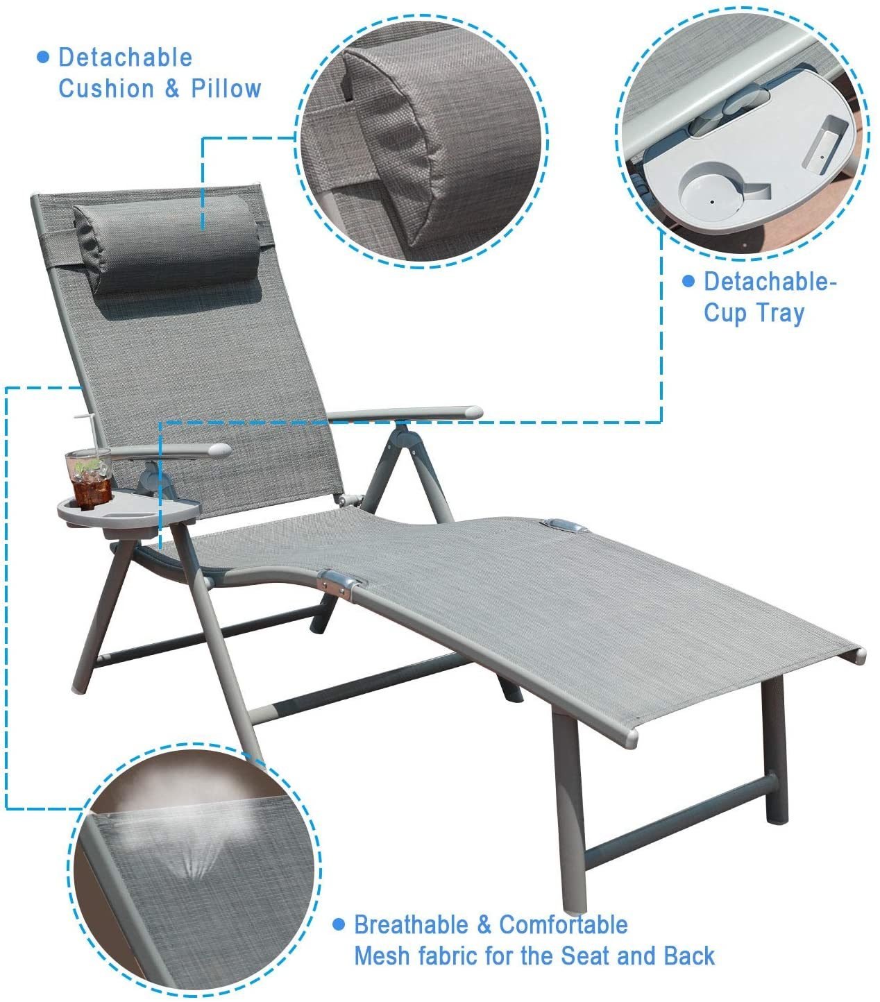 Adjustable reclinning lounge chair : By lifting the armrests on both sides; you can adjust the back of the recliner to seven different angles. The footrest can also be put down or raised up according to your needs.Durable Aluminum Frame: Featuring heavy-duty aluminum frame; the chaise lounge chair is able to withstand heavy weight which is up to 350 lbs. Moreover; the selected aluminum material not only makes the recliner lighter than others; but also resists well to rust and deformation.